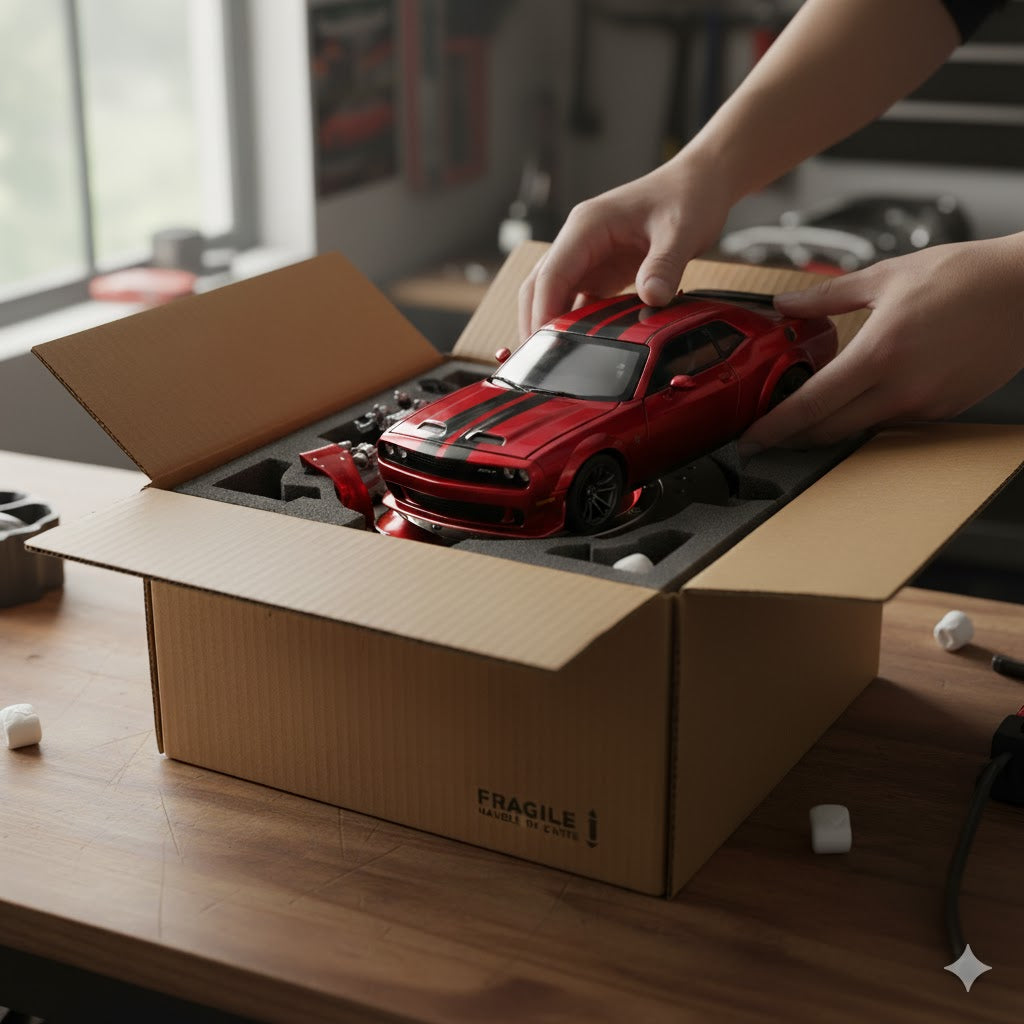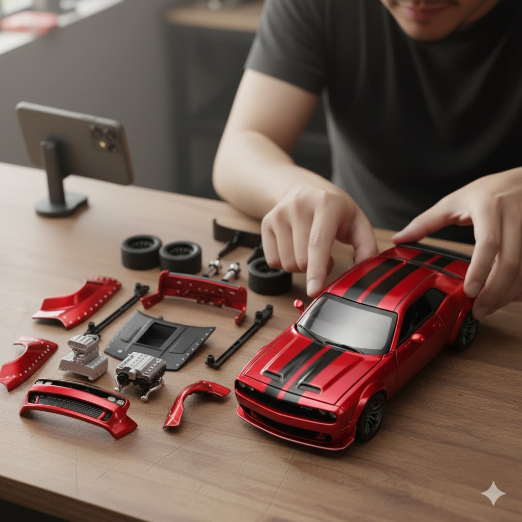 You get the full die-cast Dodge car, multiple interchangeable body parts, wheels, engine pieces, bumpers, and tools for easy assembly.